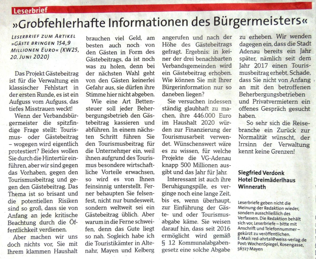 Welche unhaltbaren Fakten stecken in der Bürgerinformation? Nach meiner Recherche konnte ich die Fehler in der Bürgerinformation aufdecken. Das Vorhaben der Verbandsgemeinde wurde nach Erscheinen des Leserbriefs eingestellt.